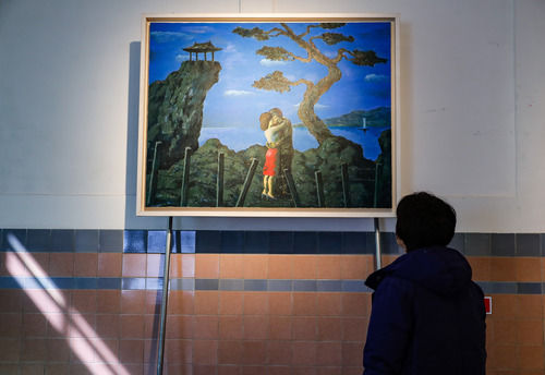 图为2019年4月2日,在韩国首尔,一名参观者在展览现场欣赏一副名为“拥抱”的油画。(新华社记者王婧嫱摄)