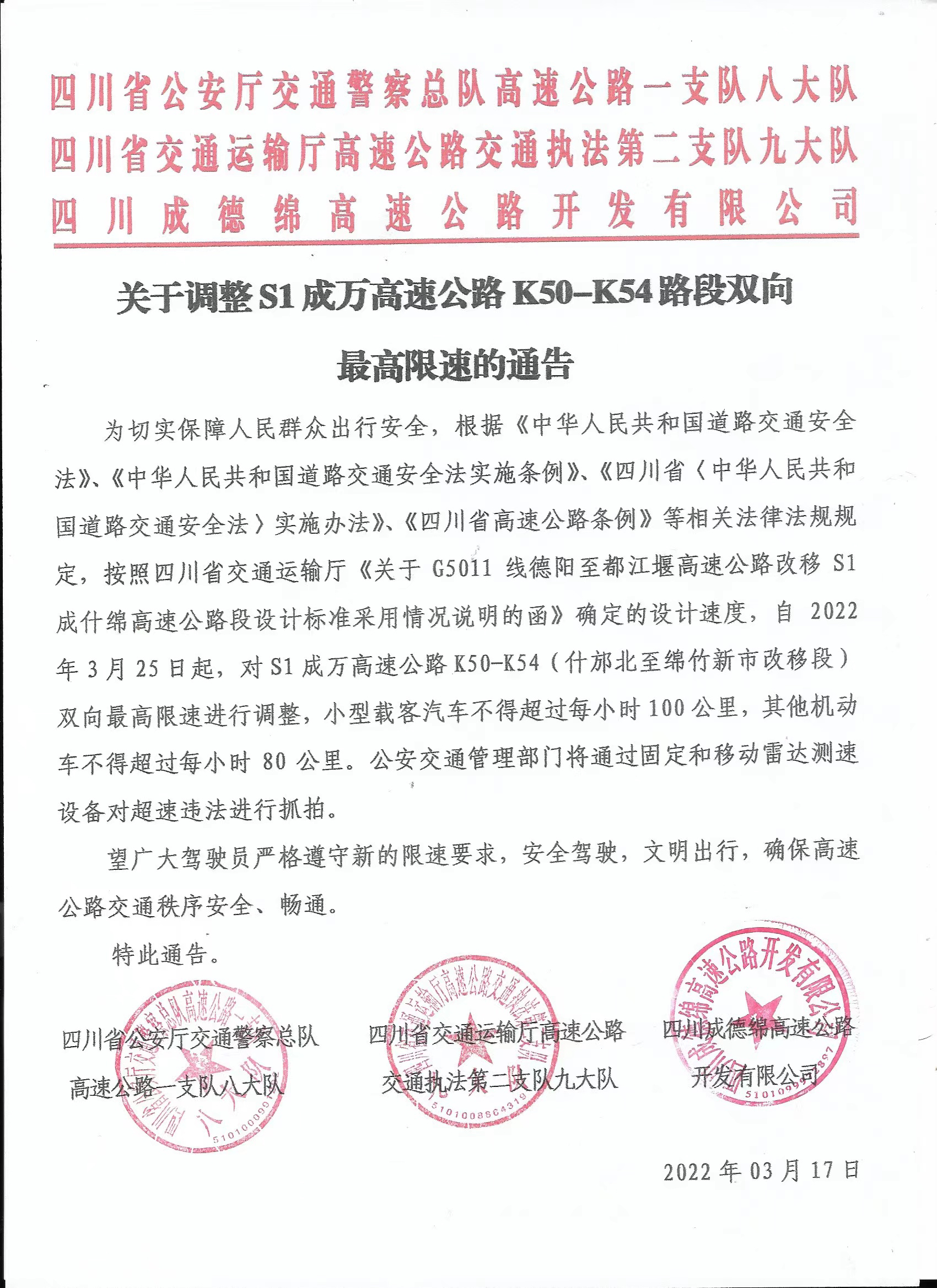 3月18日,封面新闻记者从四川省公安厅交通警察总队高速公路一支队八大队获悉,自2022年3月25日起,将对S1成万高速公路K50-K54(什邡北至绵竹新市改移段)双向最高限速进行调整,小型载客汽车不得超过每小时100公里,其他机动车不得超过每小时80公里。公安交通管理部门将通过固定和移动雷达测速设备对超速违法进行抓拍。