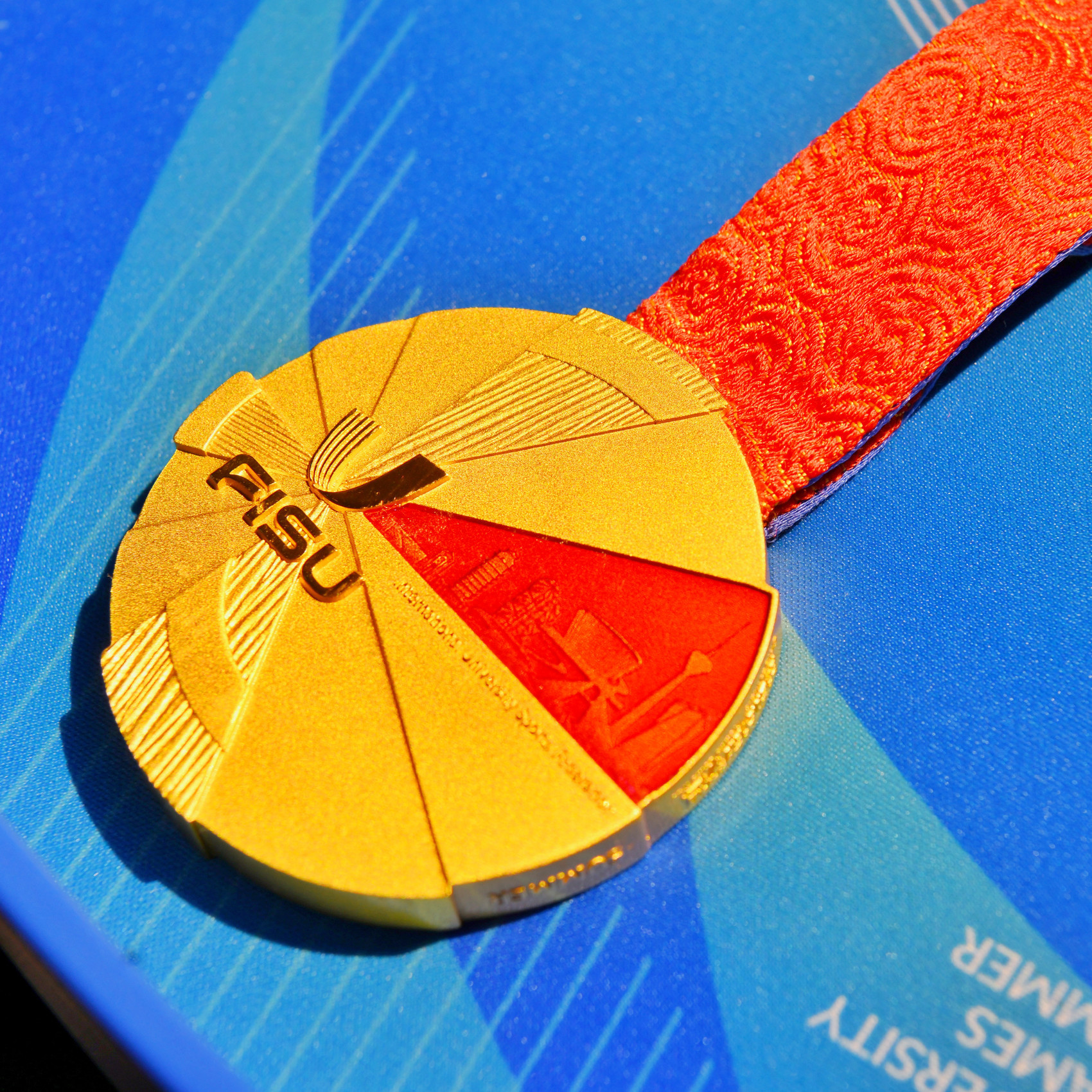 奖牌背面,设计嵌入一块红色珐琅,加入成都城市建设剪影,展示中华悠久的文明历史和成都深厚的人文底蕴,旨向全球大运健儿展示成都现代化国际大都市形象和多元包容的文化气质。同时设计将太阳神鸟羽翼置于国际大体联字母“U”底部,与其呼应,犹如神鸟,寓意守护天府之国。“奖牌侧面以激光形式印有成都大运会中英文口号。”