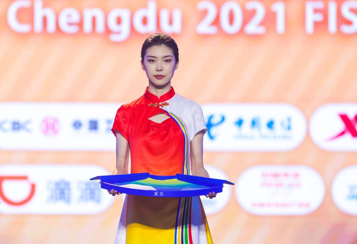 奖牌绶带颜色为红蓝相间,使用金沙太阳神鸟、芙蓉花、祥云、成都大运会会徽和国际大体联logo等图案。太阳神鸟展现着这座城市的文化底蕴与和谐包容,讴歌生命与运动;祥云纹样,寓意着祥瑞吉祥,顺心如意;蓝白格窗,传递着开放包容,互通互融,智慧诚信;而绶带上印有的“成都成就梦想”中英双语,则传达成都城市特色文化和对运动健儿的祝福。设计师马丽娃表示,绶带创新设计,首次采用国家非物质文化遗产蜀锦的工艺和材质,实现独一无二的凹凸纹理和厚重质感,将传统文化与现代设计完美融合。