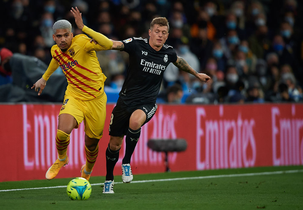 3月20日,皇家马德里队球员克罗斯(右)与巴塞罗那队球员阿劳霍在比赛中拼抢。新华社发(帕布罗·莫拉诺摄)
