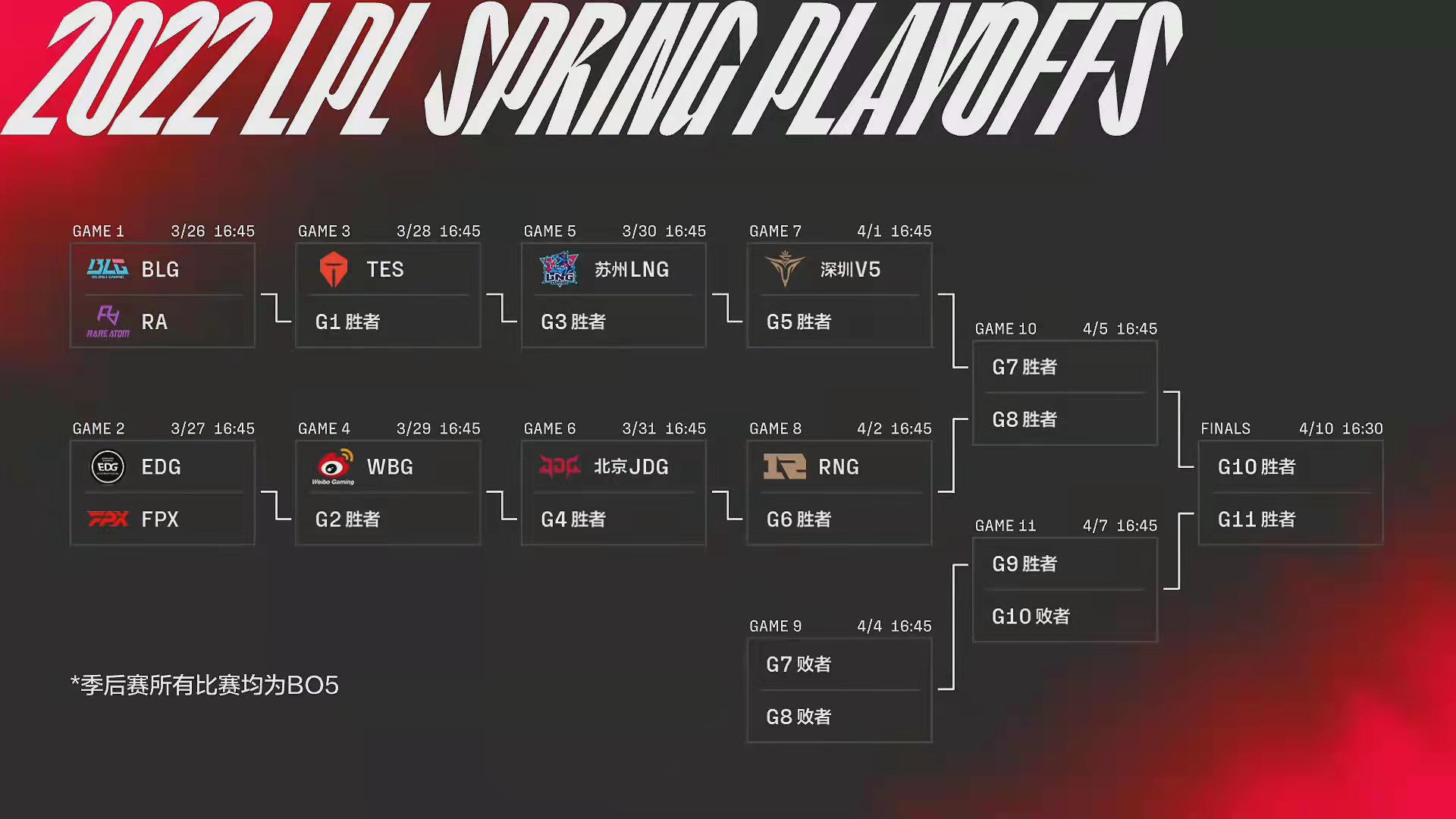 季后赛将于26日开始,首场比赛由常规赛第八名BLG对阵第九名RA。春季赛总决赛将于4月10日进行。