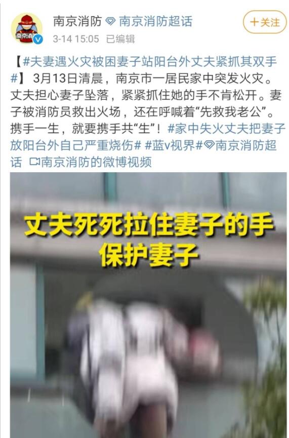 3月13日清晨,南京市雨花台区一居民家中发生火灾,一对受伤的夫妻被困阳台,火场中,男子为保护妻子,把她放在阳台外,紧抓着妻子的手防止其坠落。消防人员赶到现场后,和男子一起将其妻子拉上阳台,视频里,女子还在大喊“先救我老公”。
