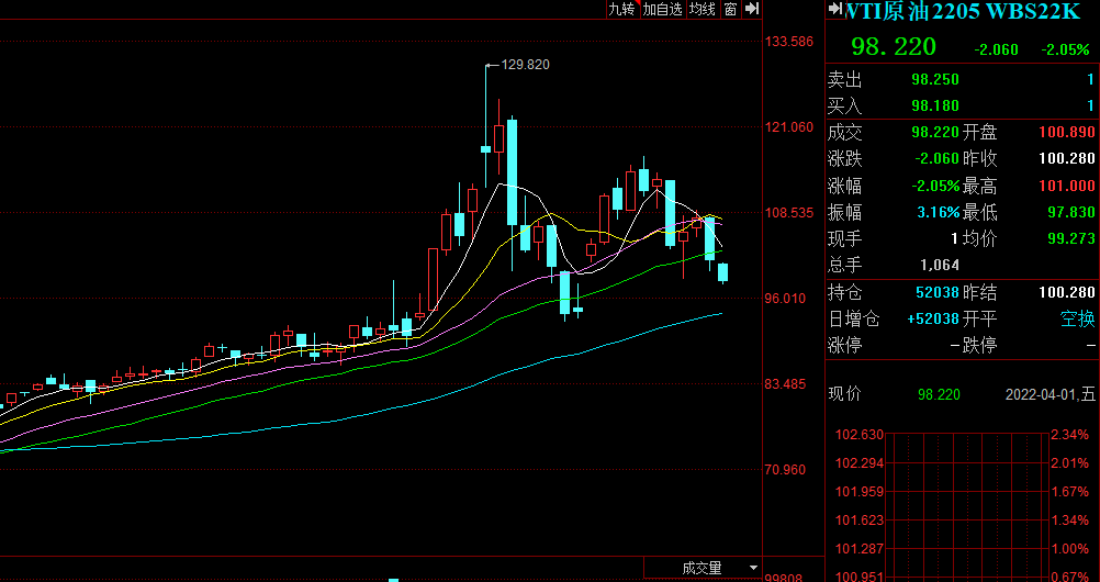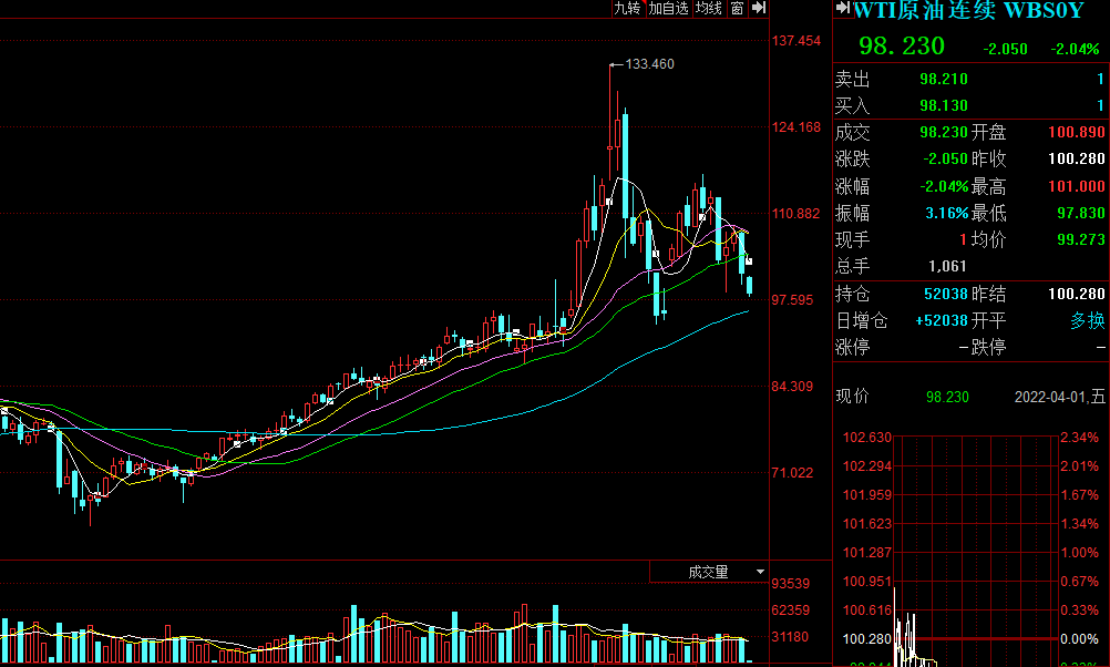 由于美国宣布将在今后半年大规模释放战略原油储备,国际原油期货价格31日大幅下跌。外盘布伦特原油期货收跌5.20%,报105.65美元/桶;WTI原油期货收跌6.14%,报101.20美元/桶。4月1日,截止收盘,国内原油主力合约报跌5.51%,报648.7元/桶。