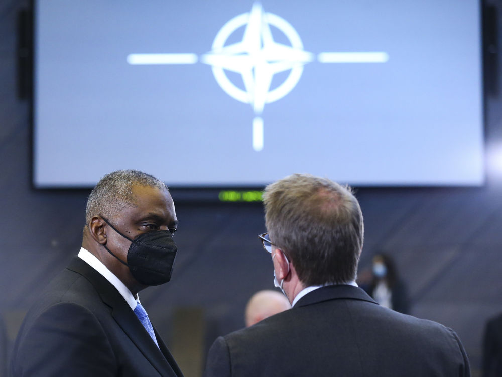 2月16日,在比利时布鲁塞尔的北约总部,美国国防部长奥斯汀(左)出席北约国防部长会议。(新华社记者郑焕松摄)