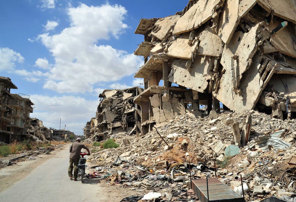 2021年9月23日,在叙利亚首都大马士革城南的耶尔穆克难民营,行人从建筑废墟旁走过。战争造成的巨大破坏随处可见。(新华社发,阿马尔·萨法尔贾拉尼摄)