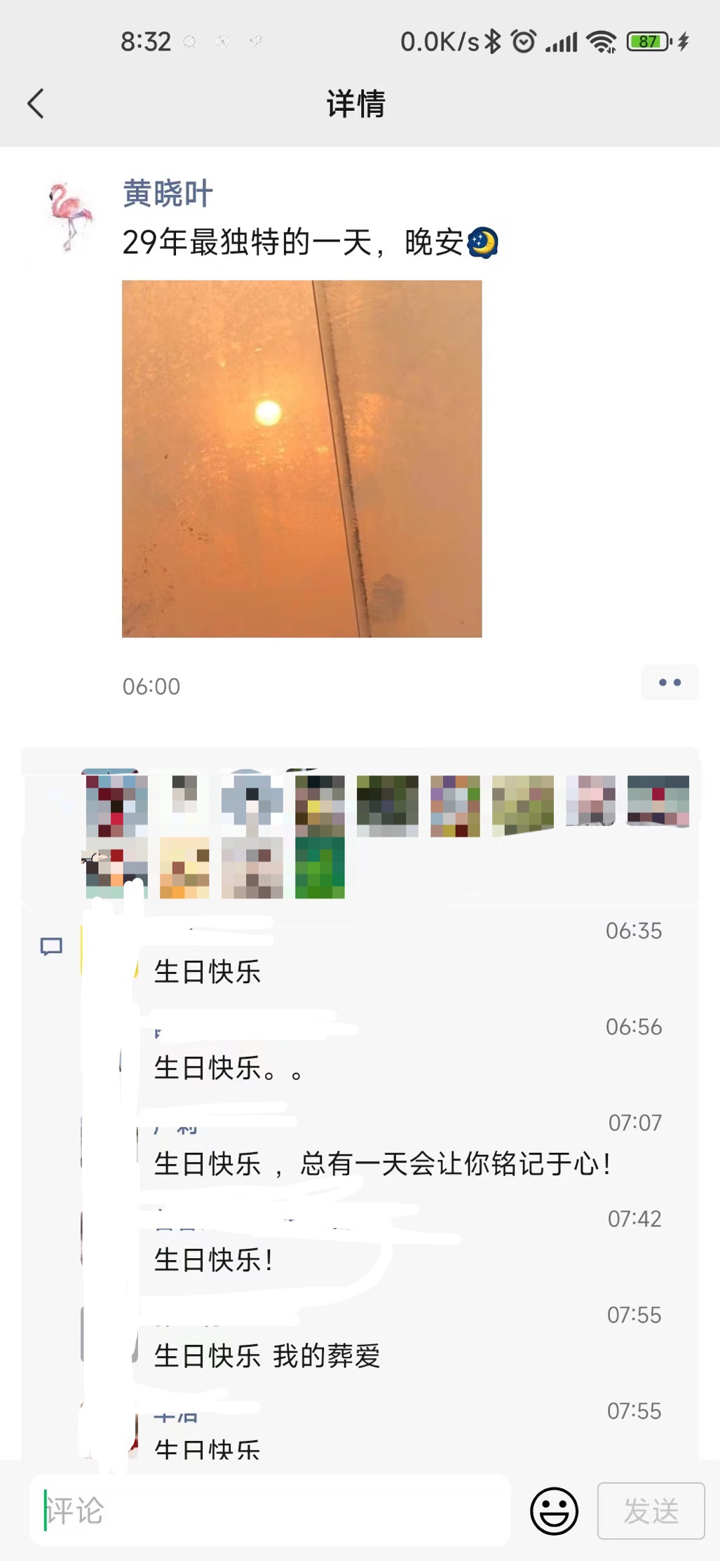 7日清晨6点,从实验室出来,看到朝阳缓缓升起,我突然想到今天是自己的生日,手机里也响起了父母祝福的短信。于是拍下了朋友圈里面那张相片,发了一段文字,祝福自己生日快乐。
