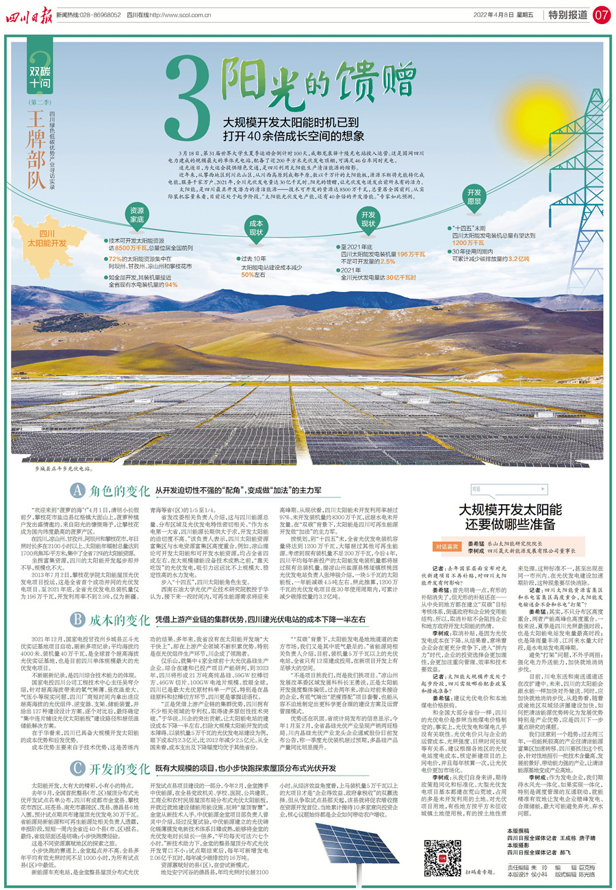 太阳能,是四川最具开发潜力的清洁能源,总量居全国前列。专家预测,太阳能光伏发电产能,还有40余倍的开发潜能