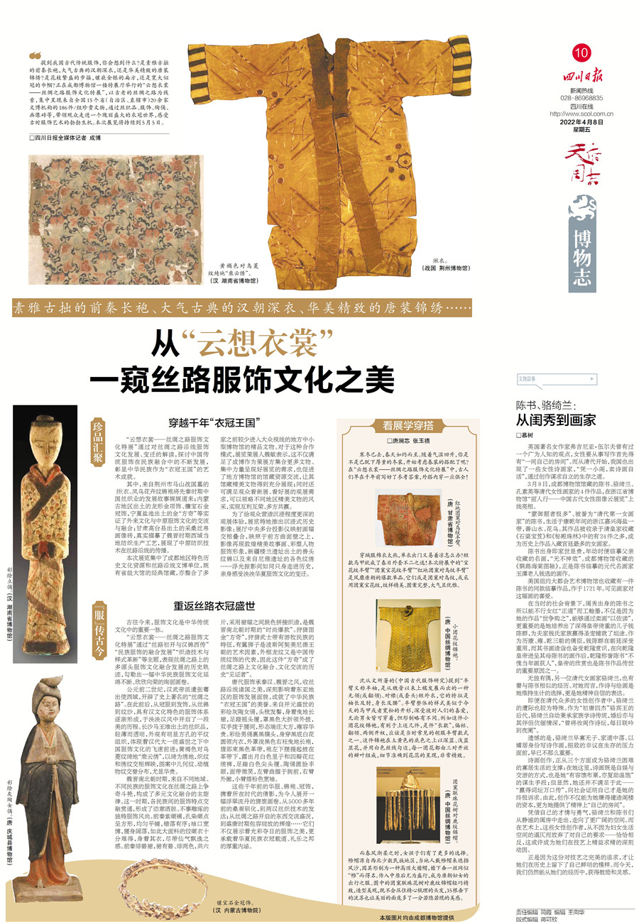 正在成都博物馆一楼特展厅举行的“云想衣裳——丝绸之路服饰文化特展”,带领观众走进一个瑰丽盛大的衣冠世界,感受古时服饰艺术的勃勃生机