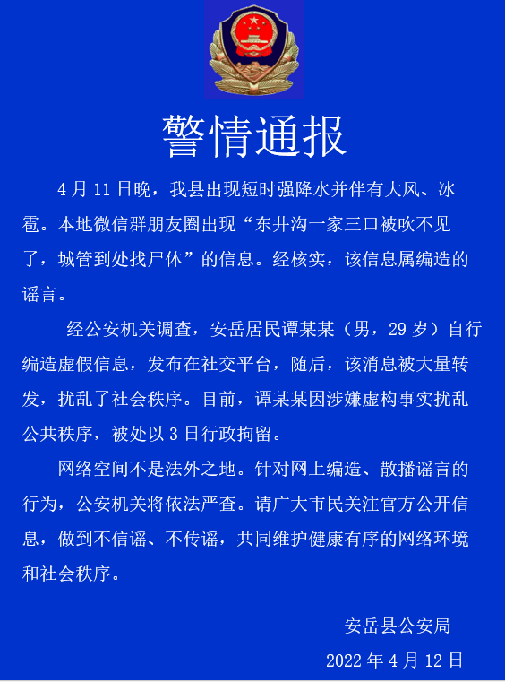 4月11日晚,四川安岳县出现短时强降水并伴有大风、冰雹。当地微信群朋友圈出现“东井沟一家三口被吹不见了,城管到处找”的谣言。4月12日,安岳县公安局发布警情通报,造谣男子谭某某被行政拘留3日。