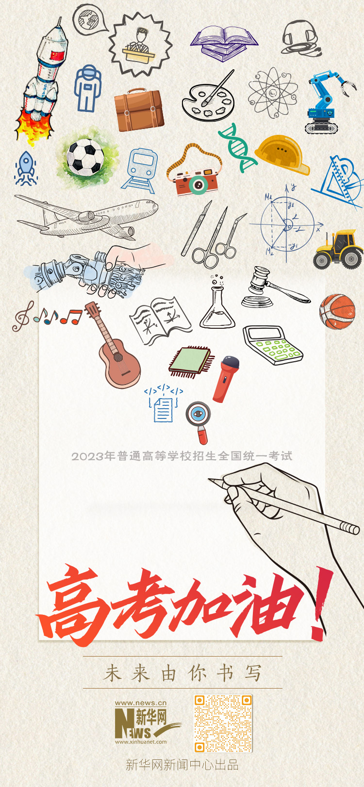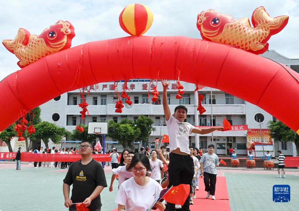 6月5日,四川省内江市第十三中学的高三学生冲过“得胜门”,希望能取得好成绩。新华社发(兰自涛 摄)