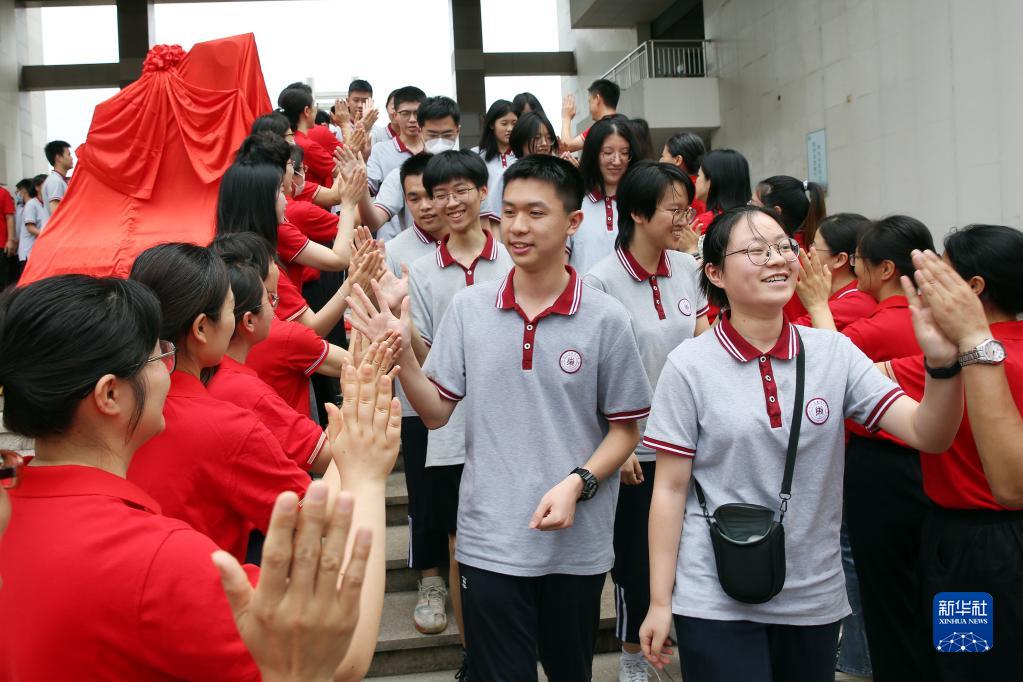 6月5日,浙江省东阳中学老师们和高三学生击掌,为他们加油鼓劲。新华社发(胡扬辉 摄)