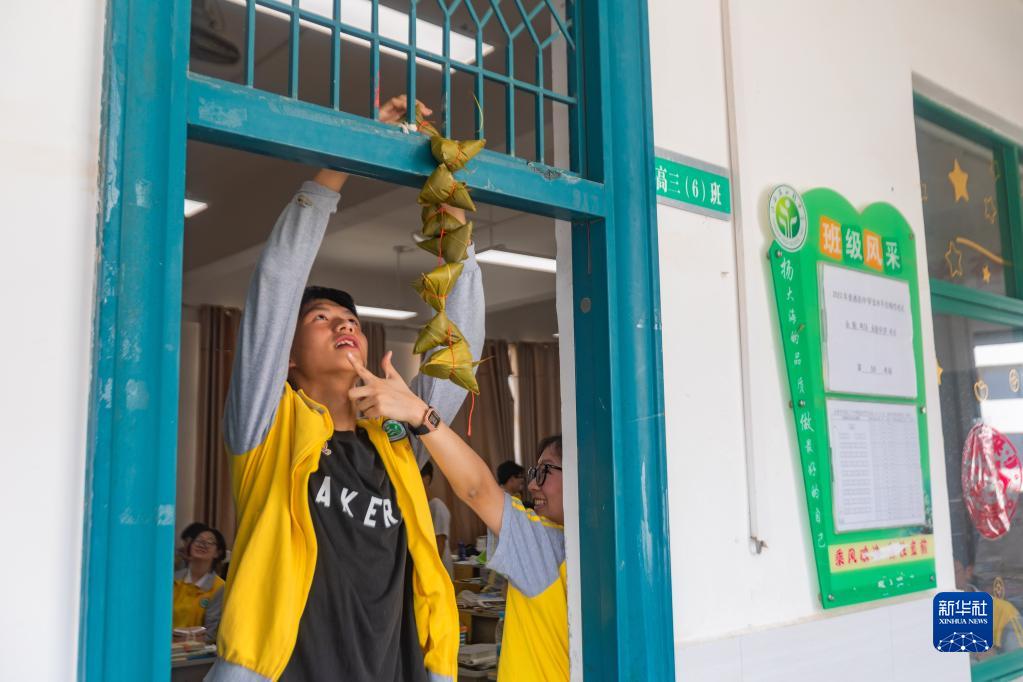 6月5日,江西省永新县永新中学学生挂起粽子,寓意在高考中“高中”。新华社发(刘平华 摄)