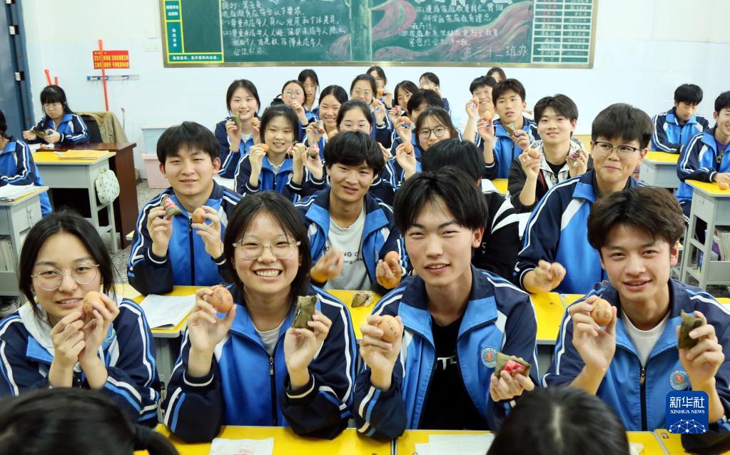 6月5日,河南省洛阳市汝阳县第二高级中学学生收到学校送上的写有高考祝福语的鸡蛋和粽子。新华社发(康红军 摄)