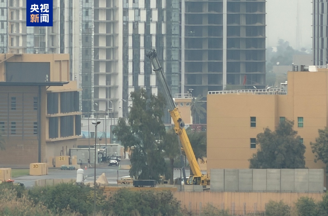 △当地时间14日,美国驻伊拉克大使馆在遭袭后对受损区域展开加固作业。