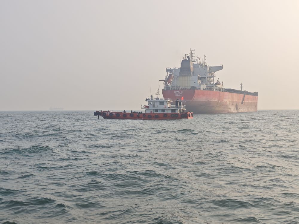 靠在货轮旁边,我们乘坐的执勤艇晃得更加猛烈。在货轮的衬托下,民警的身形显得格外渺小。出于安全考虑,记者选择在执勤艇上等候。