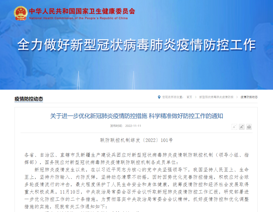 11月11日,封面新闻记者从国家卫健委获悉,国务院联防联控机制发布《关于进一步优化新冠肺炎疫情防控措施 科学精准做好防控工作的通知》(《通知》),公布了进一步优化疫情防控工作二十条措施,要求各地各部门要不折不扣把各项优化措施落实到位。