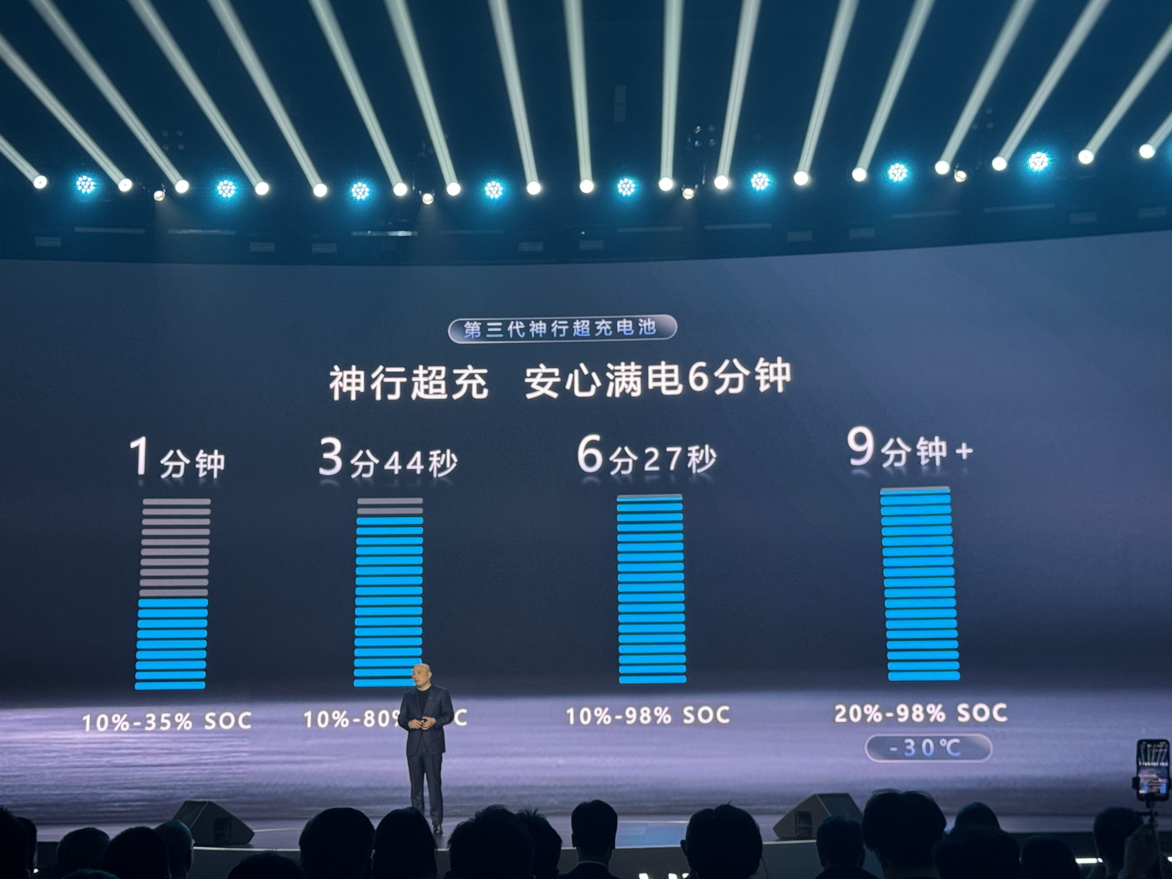 五大新品,精准覆盖全出行场景。第三代神行超充电池实现等效10C、峰值15C的全球最高充电倍率,常温下10%至98%电量仅需6分27秒,零下30℃也能9分钟完成补能,且1000次循环后容量保持率超90%,破解了“快充伤寿命”的行业死结。
