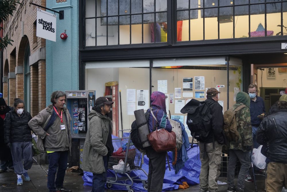 2025年11月5日清晨,在美国俄勒冈州波特兰的深秋寒意中,无家可归者排队等待从民间组织领取救助物品。新华社记者吴晓凌摄