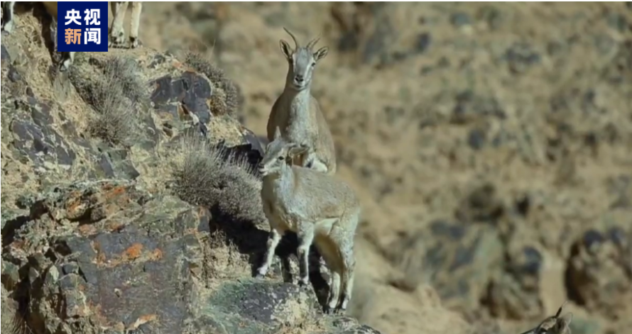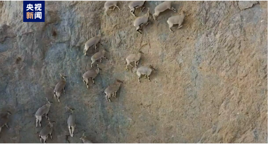 视频中,近百只岩羊在一处陡峭的崖壁上奔跑,时而低头悠然觅食,时而在崖壁间驻足停留。岩羊作为国家二级重点保护野生动物,常年生活在高山裸岩、草甸、山谷之中,具有极高的攀岩技术,也被称为“岩壁上的精灵”。