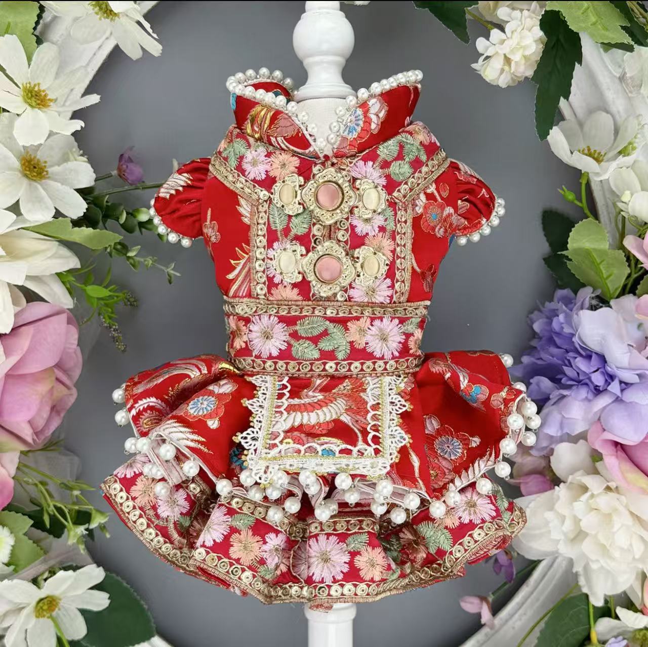 不仅要“吃好”,还要“穿靓”。国风拜年服、红色围脖、生肖限定服饰等成为热销爆款,不少商家贴心提供整套搭配,方便主人给萌宠拍一组年味十足的大片。甚至有摄影机构推出春节主题宠物写真套餐,布景充满灯笼、春联、中国结等传统元素。
