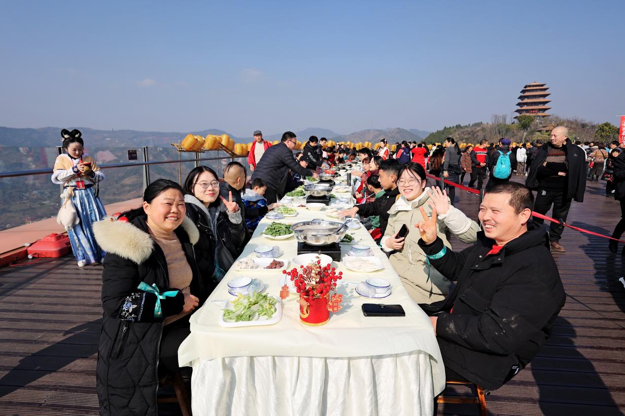 大年初一,成都东部新区丹景台景区人头攒动,热闹非凡,一场别开生面的长龙宴,在此盛大开席,近200名游客围坐在一起共庆春节。
