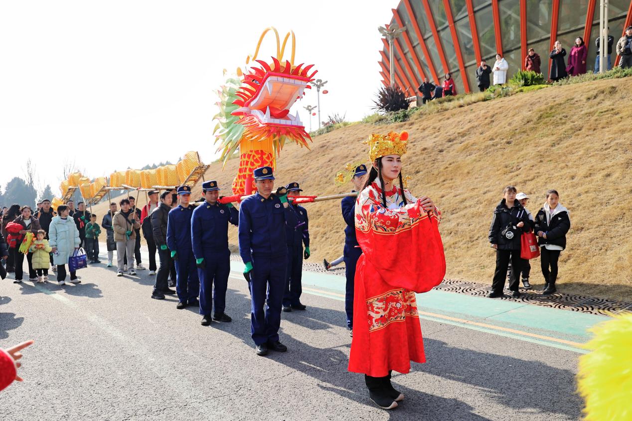 “乙巳大吉,万象更新。鸣锣舞狮,迎龙登台!”长龙宴开始前,一条长达近百米的“巨龙”出现在丹景台景区的山脚下,在欢快的锣鼓声中,金色的“巨龙”在众人的簇拥下被举了起来,浩大的长龙巡游队伍直接把春节体验感拉满。