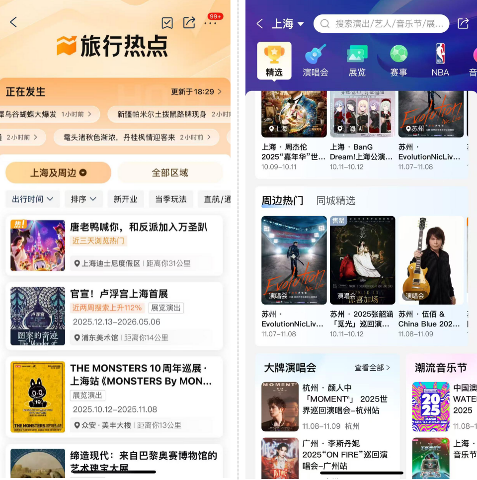 据悉,携程热点频道每月更新5000+旅行热点,覆盖全球100多个目的地:“故宫的桂花开满了”“俄罗斯对中国免签”“迪士尼万圣派对开启”等新热资讯,都可以在热点频道找到。除此以外,去悉尼跑马拉松、去苏州看伍佰演唱会等赛事展演活动已经成为旅行原动力,演出/展览频道每年上新全球10万场演唱会、音乐节、赛事、展览、演出信息,已成为旅行源动力。