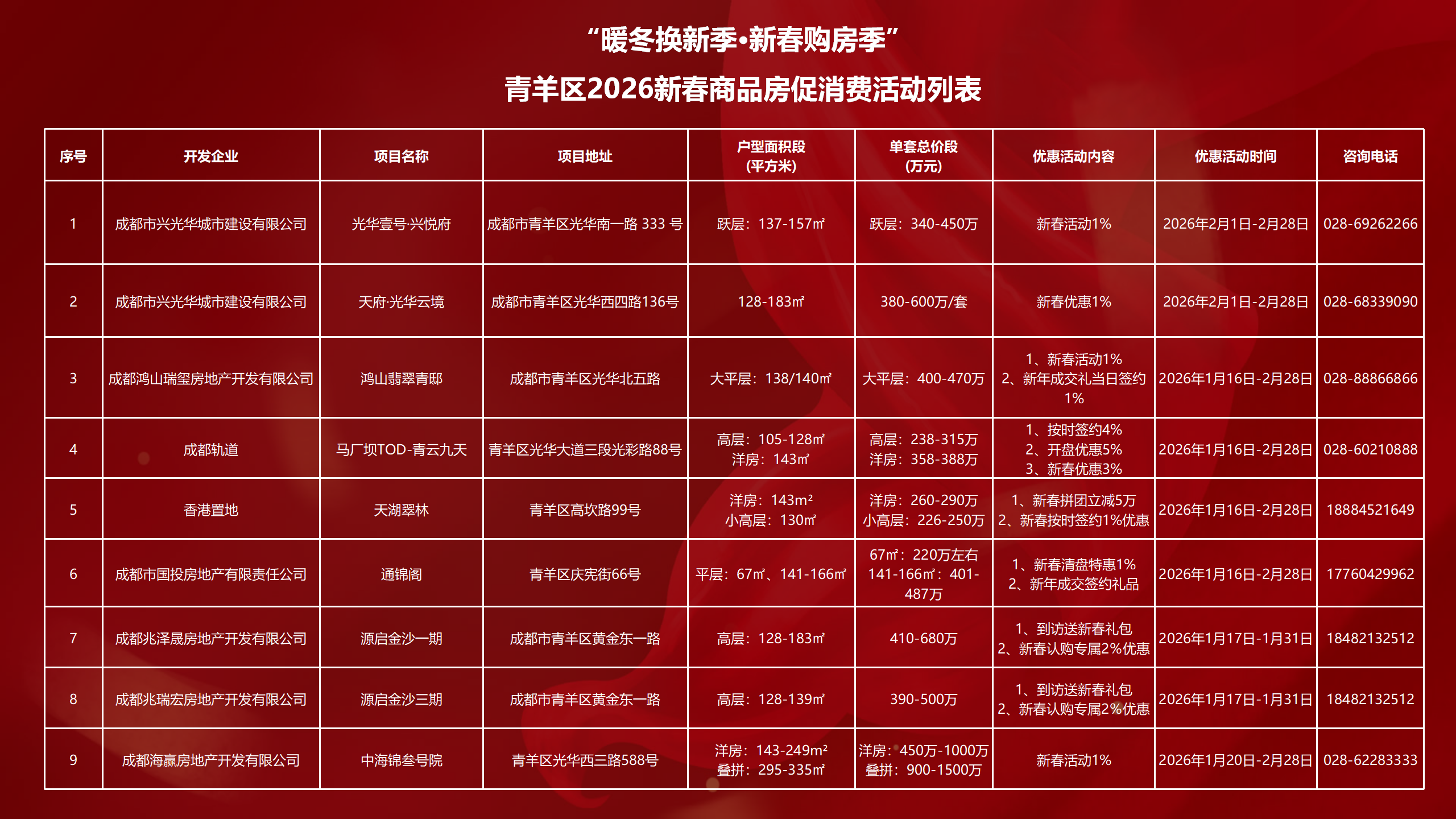 在青羊区,一场名为“暖冬换新季·新春购房季”的专题活动已于1月16日启动,将持续至2月28日。目前已有八个楼盘参与,提供1%-2%的新春购房优惠。