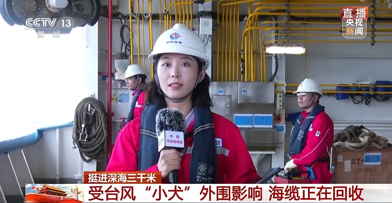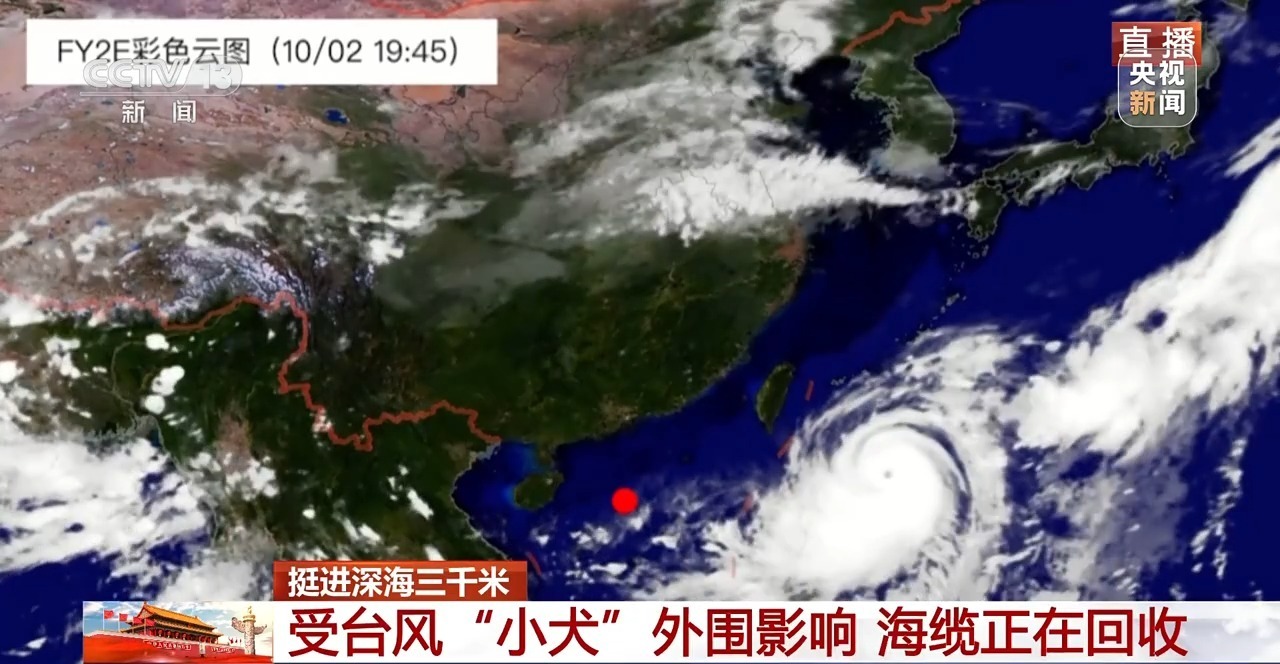 总台央视记者 王世玉:我手上有一张气象卫星云图,这是台风“小犬”的预测路径,那么台风会不会影响勘探任务呢?探测团队告诉我,其实所有海面的探测任务在今天凌晨时已经完成了。所以现在海缆回收,一方面是因为勘探已经完成,一方面也是为了确保安全。