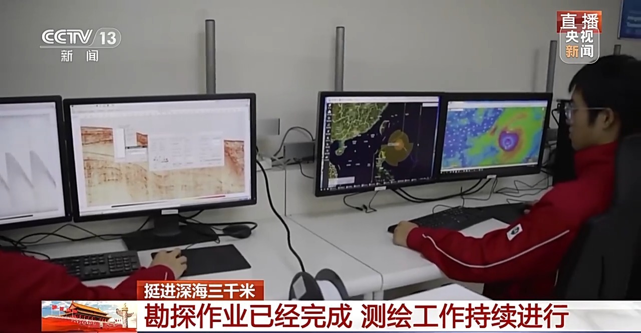 总台央视记者 王世玉:勘探作业现在已经完成了,探测团队的工作重心也都转到了首张海底图的绘制当中,目前进度已经有95%左右了。现在数据的转化,包括三维的建模、3D打印的工作都在有序进行。预计在今天下午,首张海底三千米的深水地质勘探图就会绘制完成,并将会在我们的直播中首次发布。