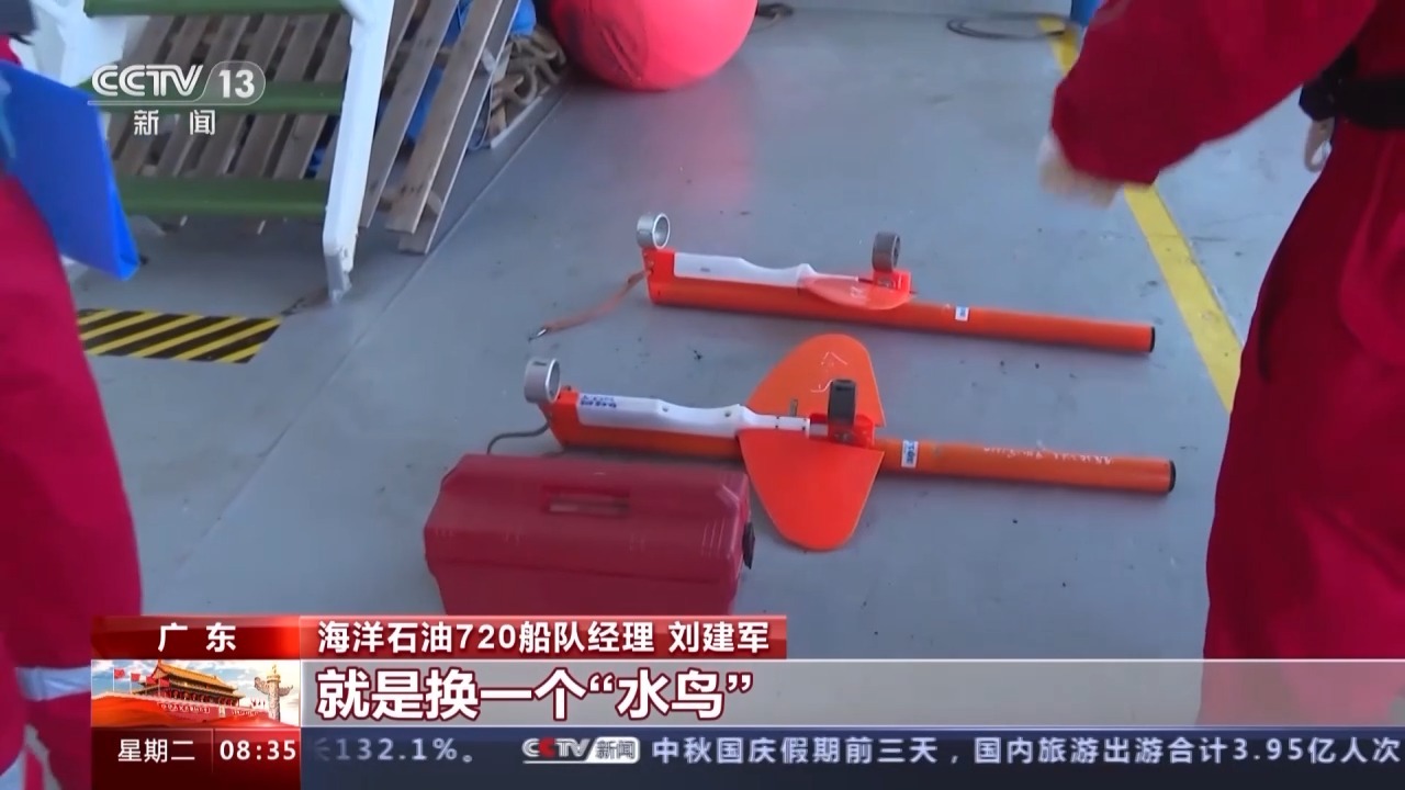 “海洋石油720”船队经理 刘建军:我们本次任务其实比较简单,就是换一个“水鸟”,你看摆了两个,海上作业不确定性太大,所以我们一般都是用一备一。