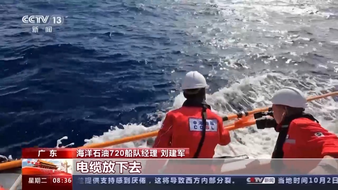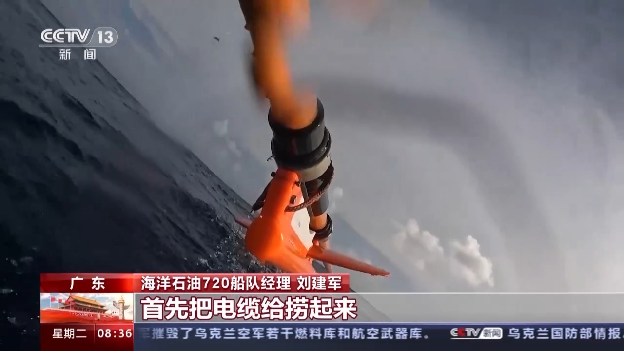 总台央视记者 王世玉:我们现在是在“海洋石油720”船的四层甲板,从今天早上就觉得整个船的晃动比以往更加明显,尤其到了船尾的位置。现在海上的浪涌基本上是这几天最大的。工作人员正在进行海缆的回收工作,原来是我们和台风可能要打一个小小的“照面”。