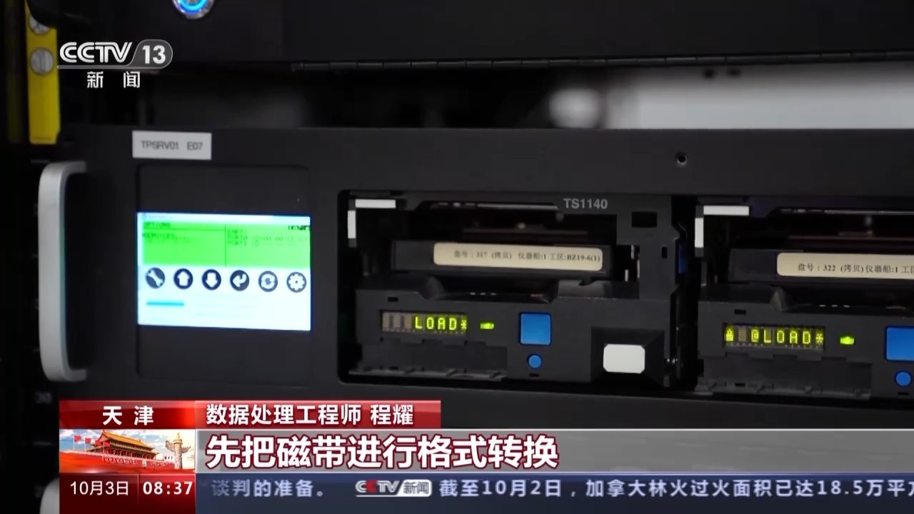 数据处理工程师 程耀:我们用这台专用的磁带机,先把磁带进行格式转换,然后存储到服务器上,就可以在计算机上进行数据处理了。处理50个T的数据,我们团队3个人至少需要6个月的时间,才能描绘出一个初步的地层图像。