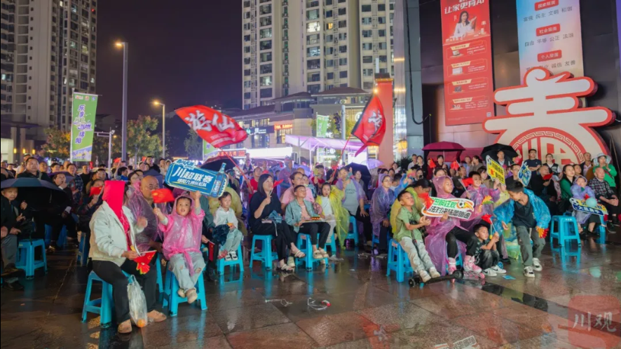 冒雨观看户外大屏“川超”比赛的观众 图据川观新闻
