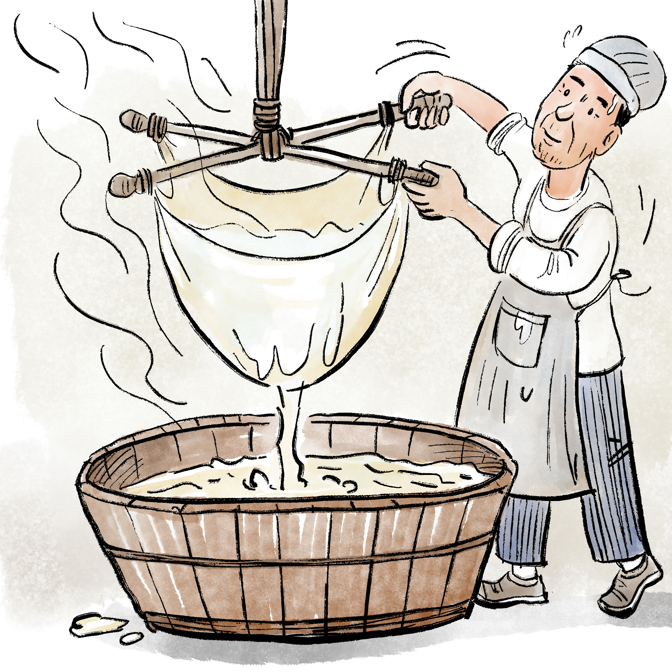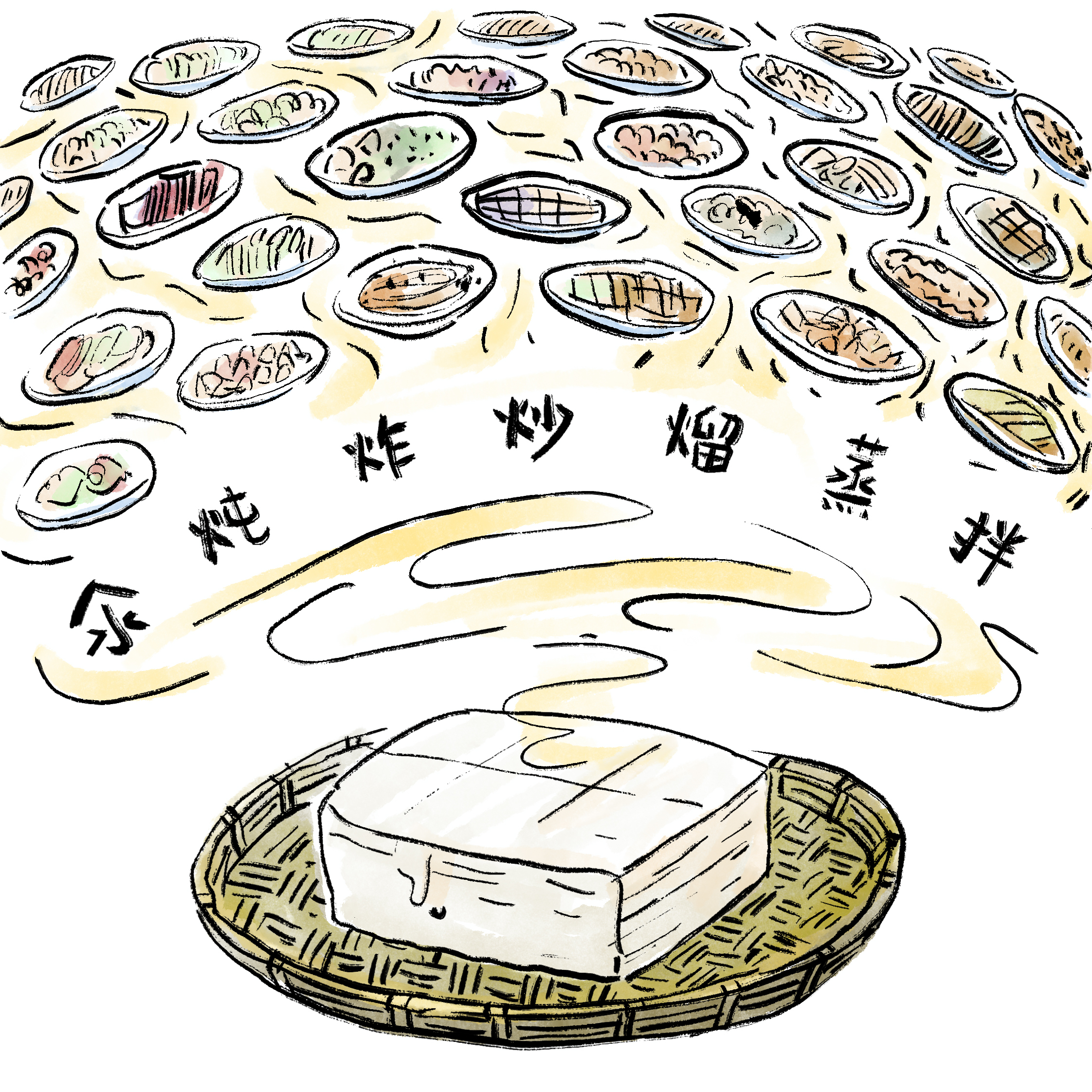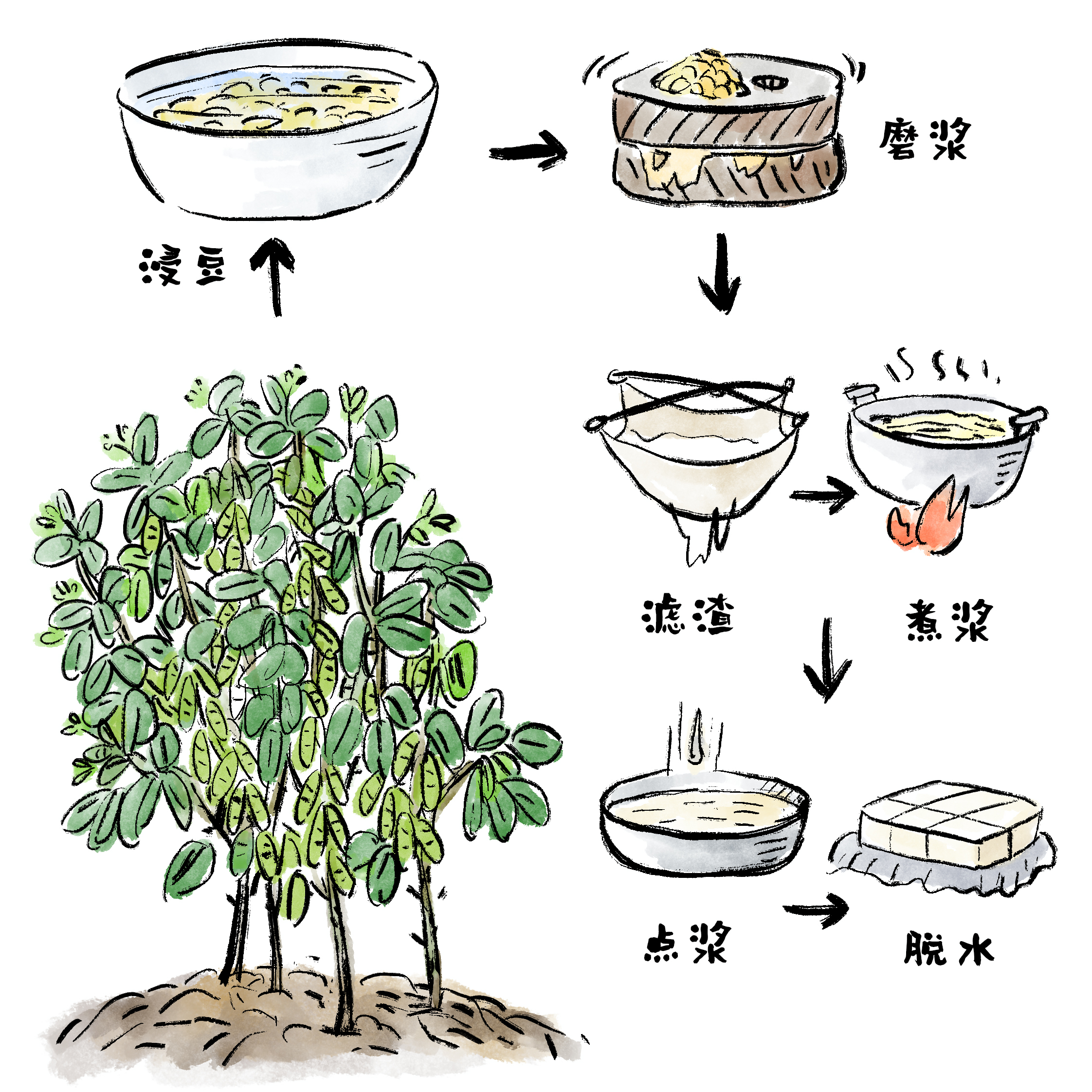 剑门豆腐以剑门山区砾岩油沙石土出产的黄豆为原料,使用来自剑门七十一峰的剑泉水,经浸豆、磨浆、滤渣、煮浆、点浆、脱水等工序制成。
