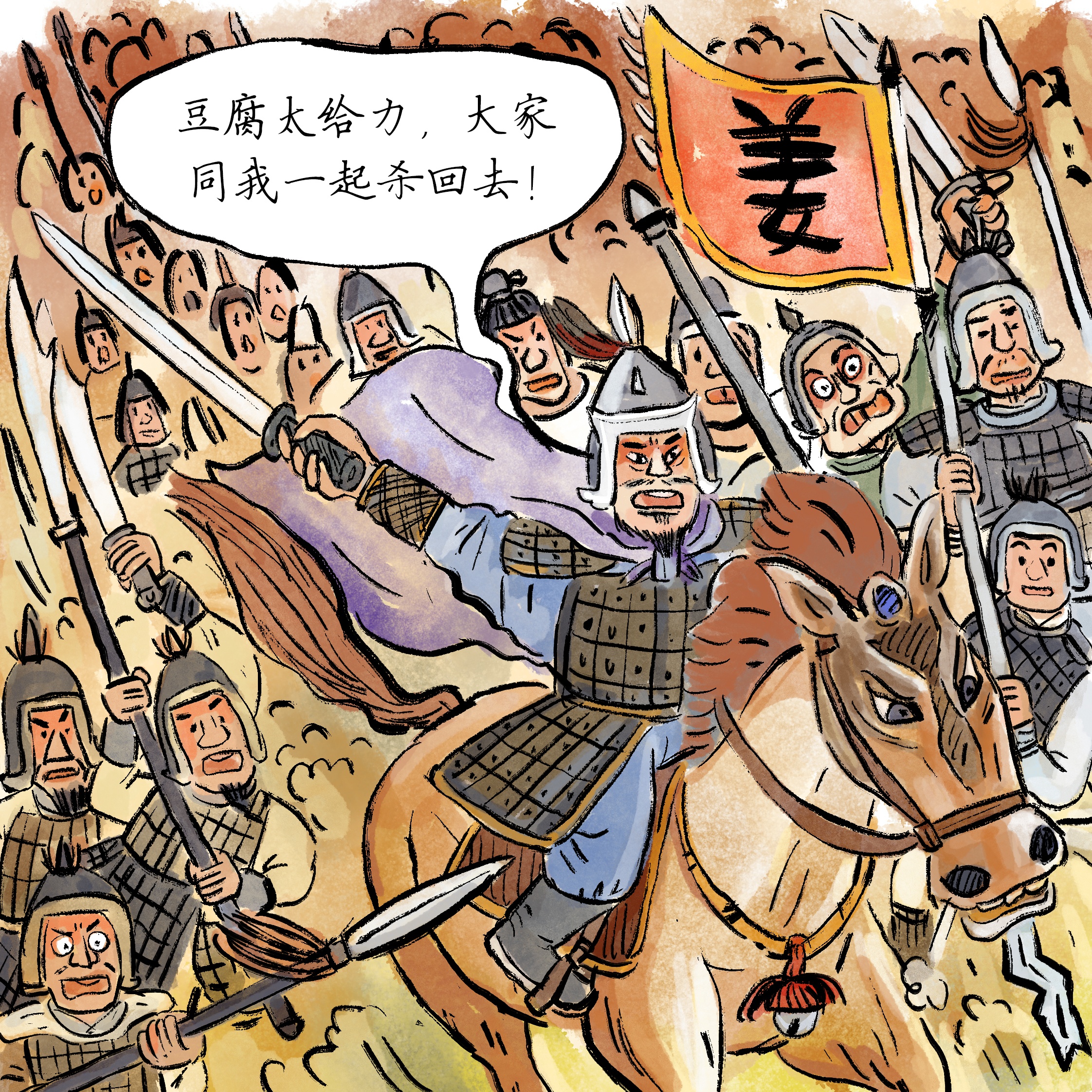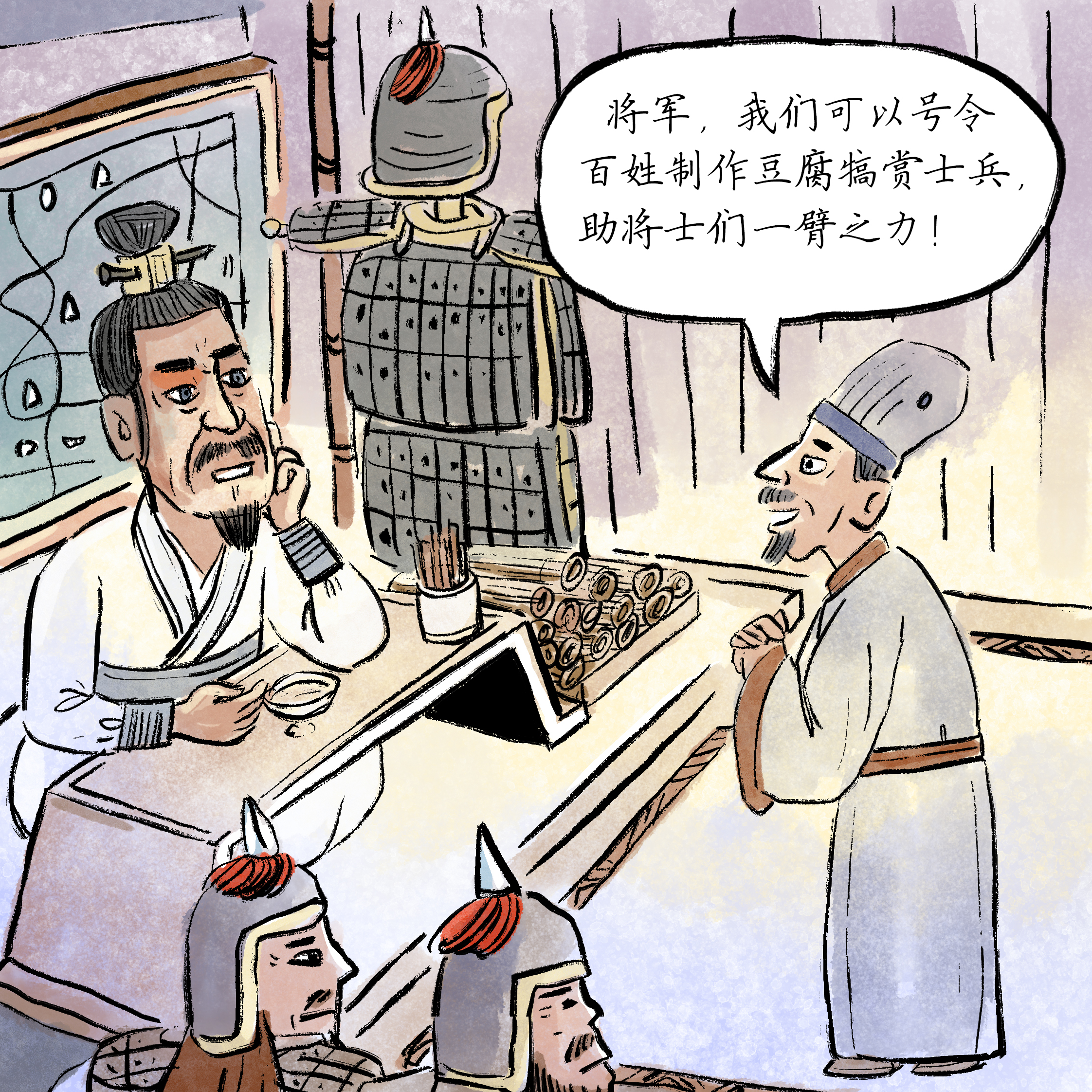 当时姜维营中兵疲不能战,马乏不能骑,眼看蜀北屏障剑门危在旦夕。剑门一地方官忙向姜维献计:闭关三日不战,号今百姓家家磨豆浆,以豆腐犒赏士兵,以豆渣喂战马,待兵马体力恢复再战。