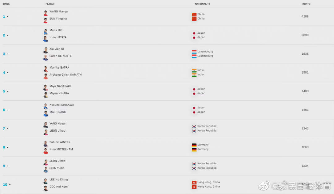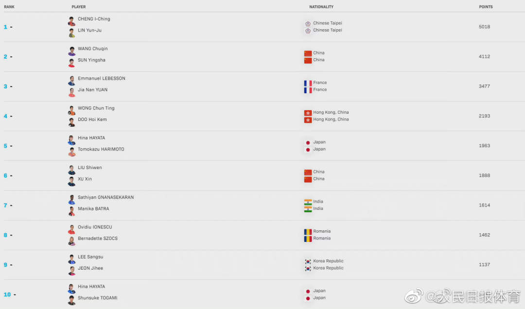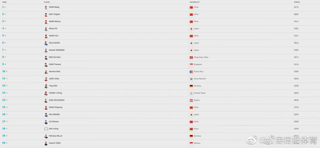 女单方面:陈梦第一,孙颖莎第二,王曼昱第三、王艺迪第五、陈幸同第十五位,刘诗雯和朱雨玲分列十七和十八位。