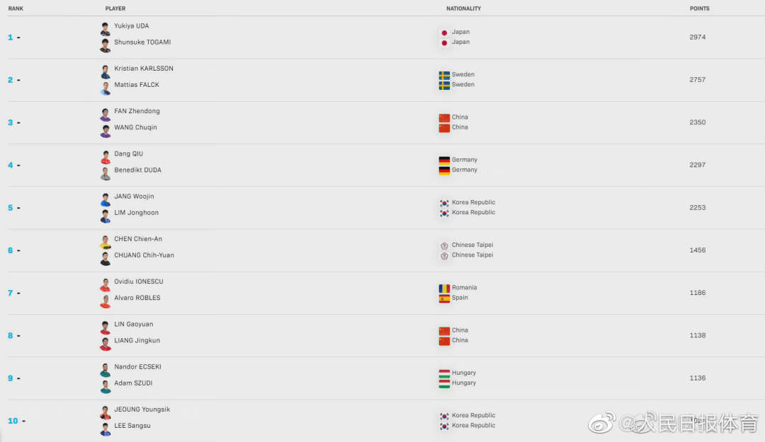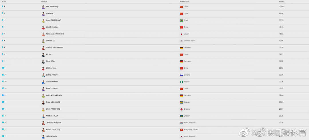 男单方面:樊振东第一、马龙第二、梁靖崑第四、林昀儒第六、许昕第八、林高远第十、王楚钦第十三;