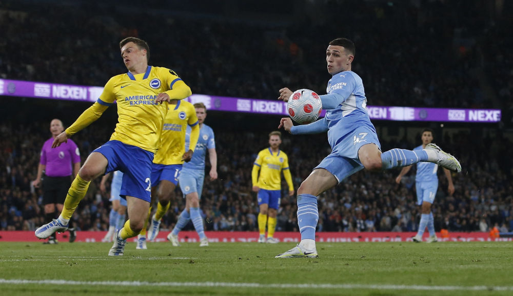 4月20日,曼彻斯特城队球员福登(前右)在2021-2022赛季英超联赛第30轮的一场补赛中射门得分。新华社/路透