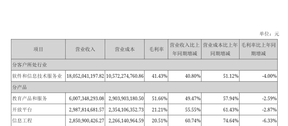 具体到主营业务线,教育产品和服务业务为拉动收入的主引擎,在2021年全年录得收入60.07亿元,同比增长49.47%,在总营收中占比达到32.82%。此外,开放平台业务收入为29.88亿元,同比增长55.55%;智慧城市信息工程业务实现收入28.51亿元,同比增长60.74%。