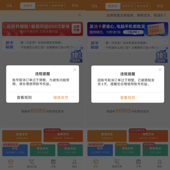 对于提醒后仍拒不整改的用户,平台会根据违约单量、违约率,结合举报、投诉和司机实际损失等情况,按照违规情节的严重性,对货主账号进行弹窗警告、流量降权、违约罚款、临时停用一口价发货、临时停用发货等一系列管控措施。