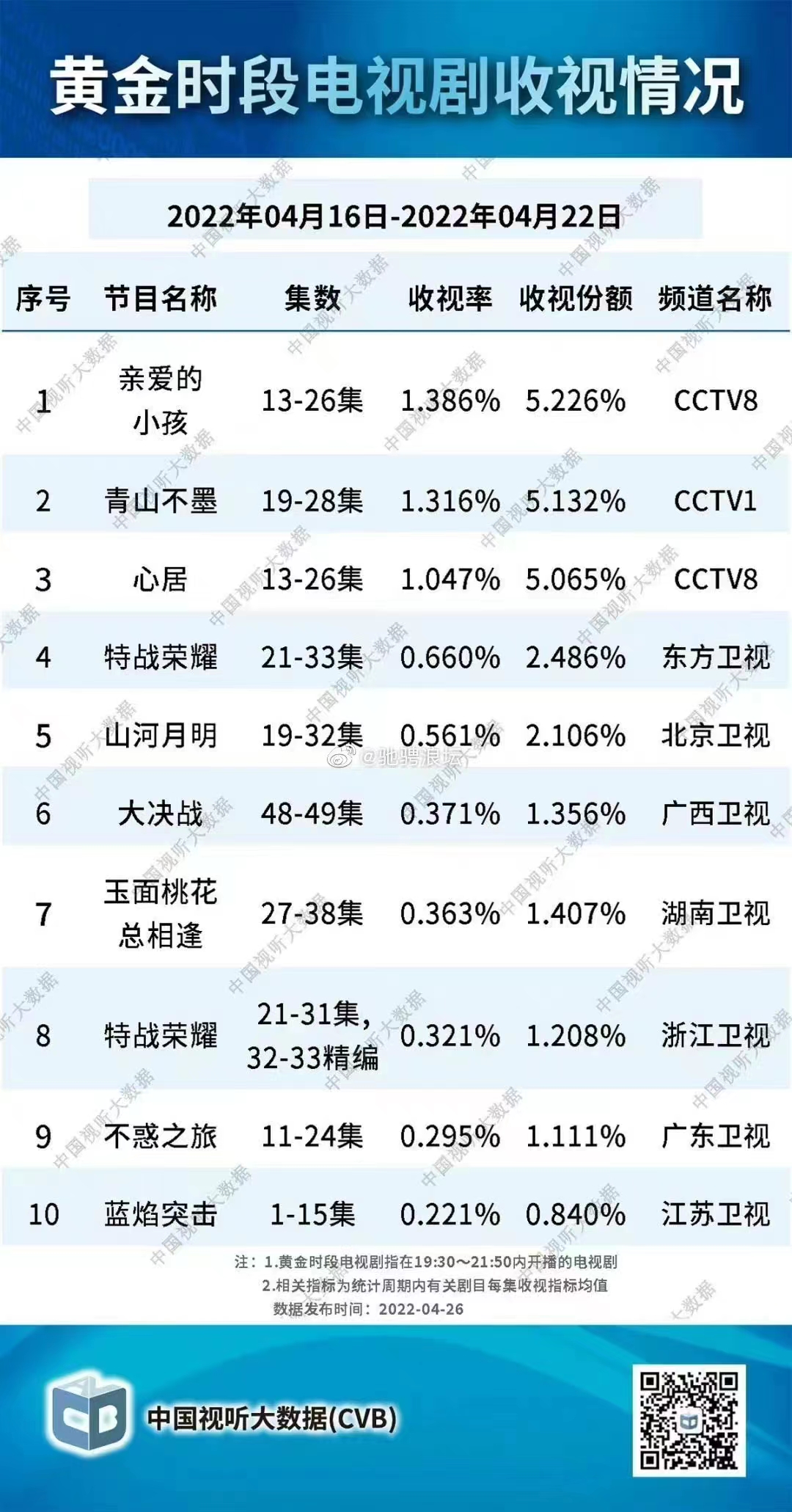据中国视听大数据发布,2022年4月10日-4月15日(1-12集),《亲爱的小孩》每集平均收视率1.289%,位列黄金时段电视剧单频道收视率第4名,4月16日-4月22日(13-26集),每集平均收视率1.386,位列黄金时段电视剧单频道收视率第1名。据央视索福瑞35城市数据,4月10日—4月26日 平均收视率为1.039,位列排行榜第二名。据酷云数据,收视直播关注度和市占率始终排名第一。
