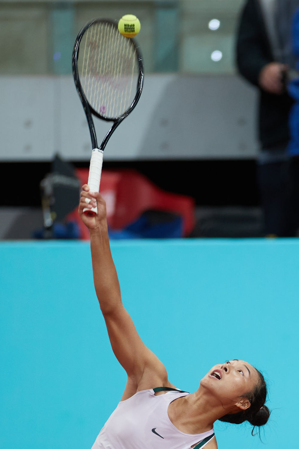 4月28日,郑钦文在比赛中发球。新华社记者孟鼎博摄