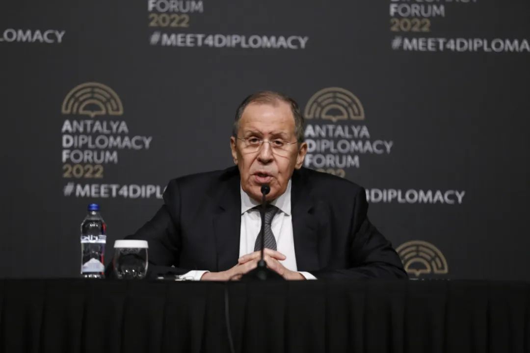 3月10日,在土耳其安塔利亚,俄罗斯外长拉夫罗夫与乌克兰外长库列巴(未在画面中)会谈后召开新闻发布会。新华社记者李振北摄