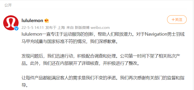 lululemon在回应中称,对于Navigation男士羽绒马甲充绒量与国家标准不符的情况深感歉意。发现问题后,公司积极配合调查和处理,同时还在内部展开详细核查,并积极进行了整改。