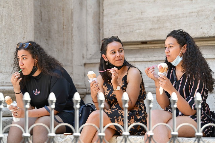 图为2021年7月11日,人们在意大利罗马吃冰淇淋消暑。新华社记者金马梦妮摄