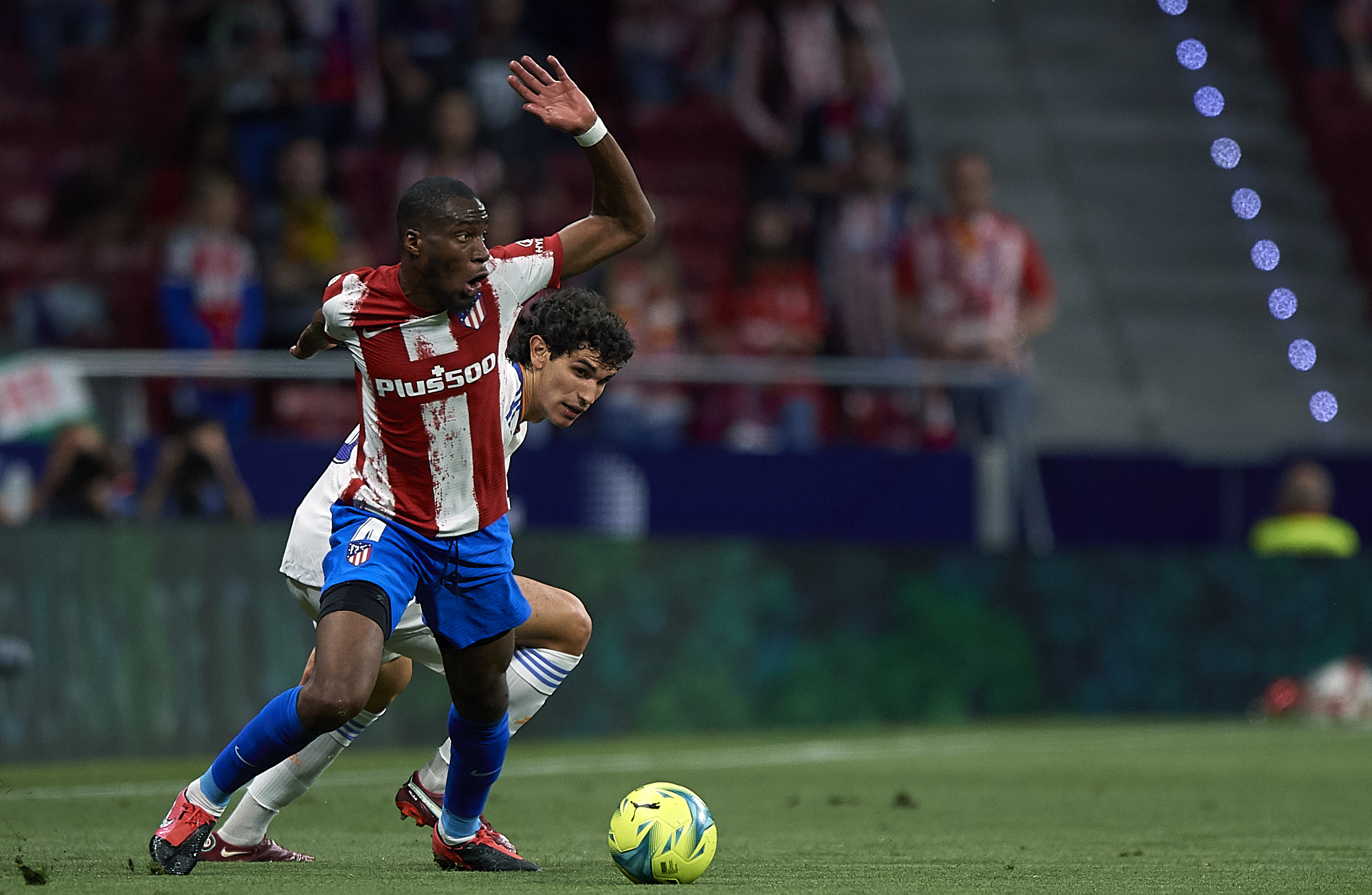 5月8日,皇家马德里队球员巴列霍(后)与马德里竞技队球员孔多比亚在2021-2022赛季西班牙足球甲级联赛第35轮比赛中拼抢。新华社发(帕布罗·莫拉诺摄)