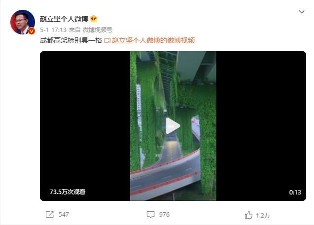 近日,外交部发言人赵立坚在个人微博转发了一段关于成都二环高架桥的视频。视频中,绿色的爬山虎长满了高架桥桥墩,车辆在其间穿行,画面十分美丽,全国网友瞬间表示羡慕。