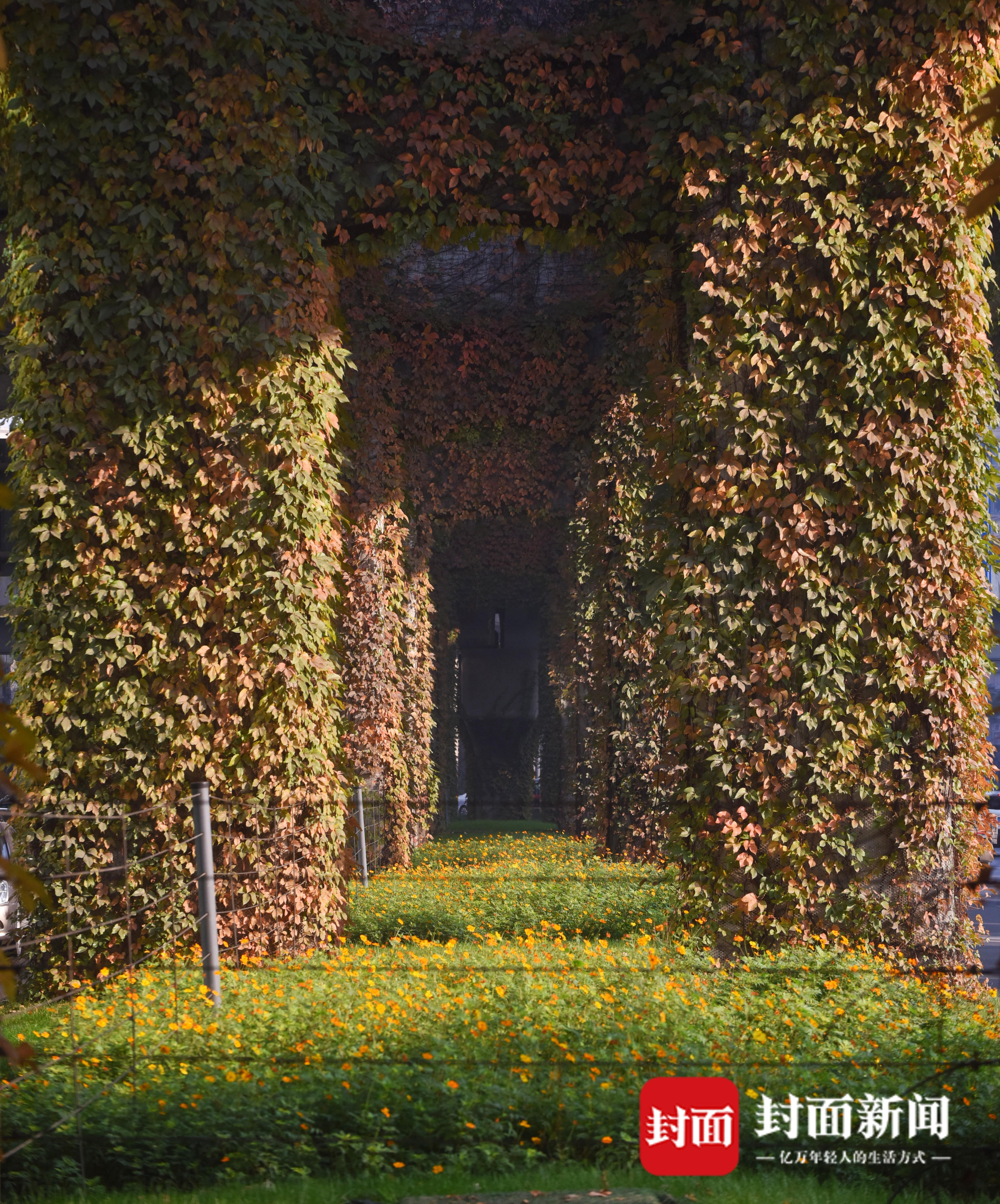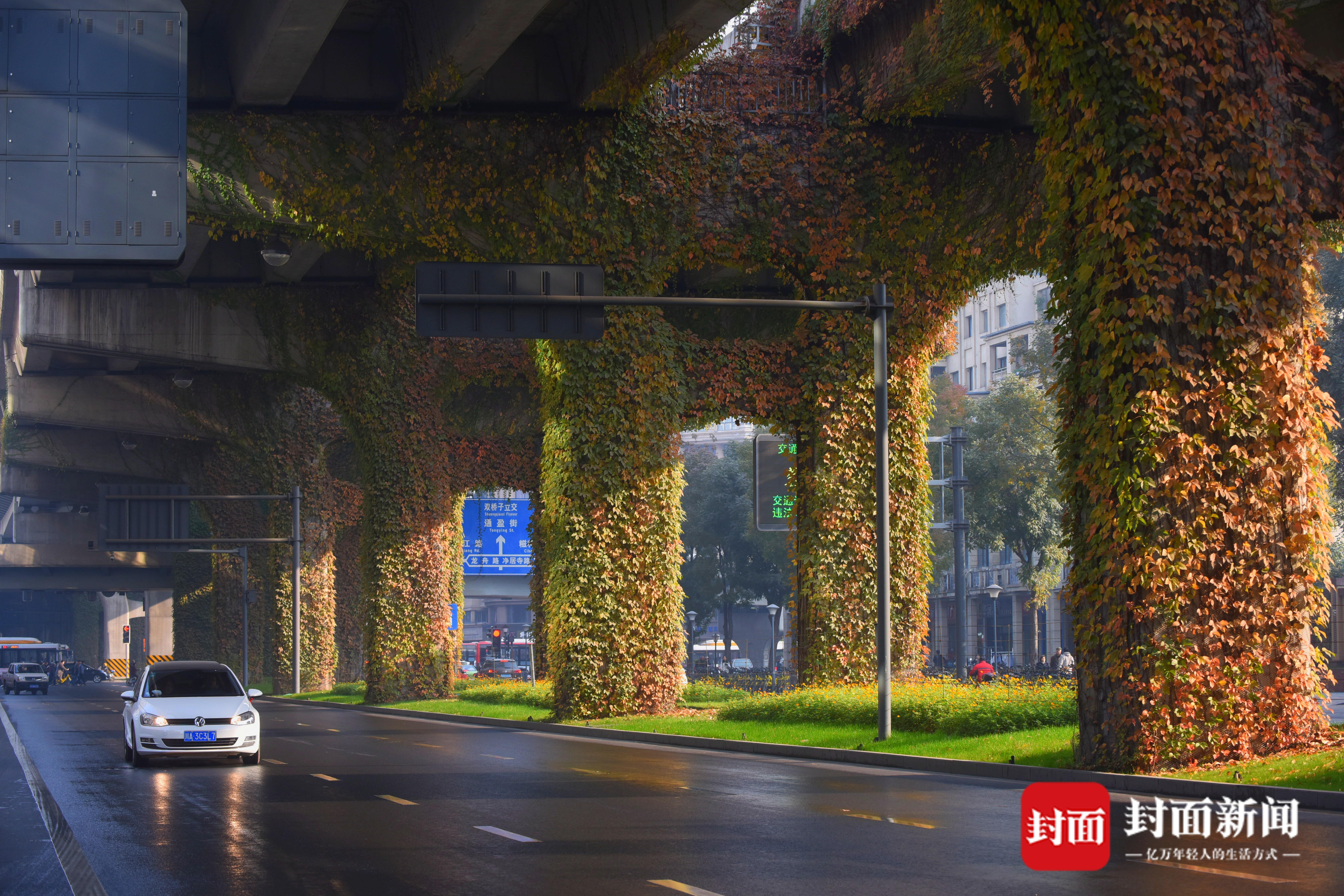 成都市民陈先生介绍,二环高架上的爬山虎在四季会有不同的颜色。在炎热的夏天是绿色,这时候爬山虎就像绿色的绒毯一样铺满桥墩,行经在此就好像穿越绿色隧道一样。而到了冬天天气转冷,爬山虎又从绿色渐渐变成红色、黄色,桥墩犹如“穿了一件多彩的衣服”,二环路也变成了“彩色长廊”。